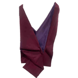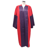 Purchase of a full set worn by PhD students graduating from the University of Bristol, consisting of a gown and hood. The gown is red and features purple cuffs and facings. The hood is burgundy, lined purple.