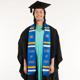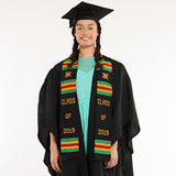 Our traditional kente cloth graduation stoles are produced in partnership with Indigenous House, which supports artisans in Ghana. Each stole is handwoven and can be customised with the purchaser's graduation year and initials.