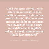Hired items will arrive at your delivery address at least 2 days before the ceremony date you select at checkout. A prepaid return label and instructions will be included for sending them back.
