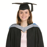 Full set, consisting of a cap, gown and hood for use by masters students graduating from the University of Exeter.